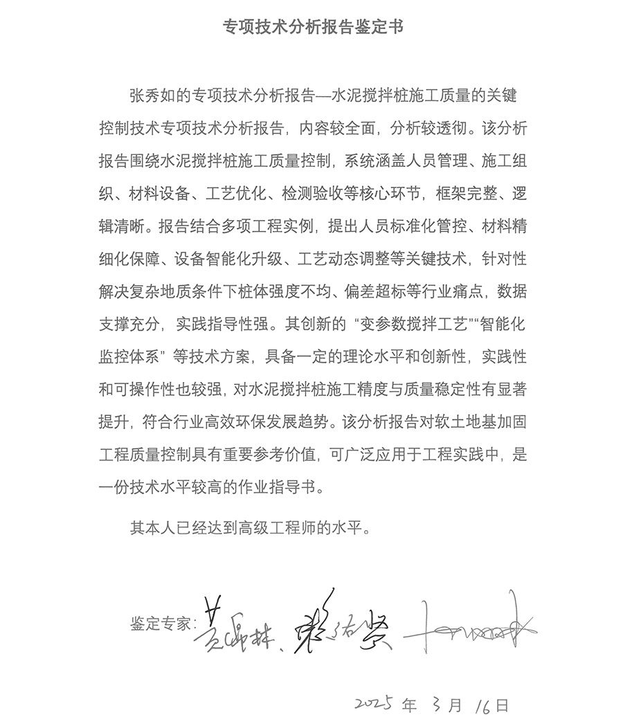 ● 水泥掺量:通过触探击数(N10≥35 击/30cm)及钻芯取样(28 天无侧限抗压强度≥1.0MPa)确定最佳掺量,确保桩体强度达标。
